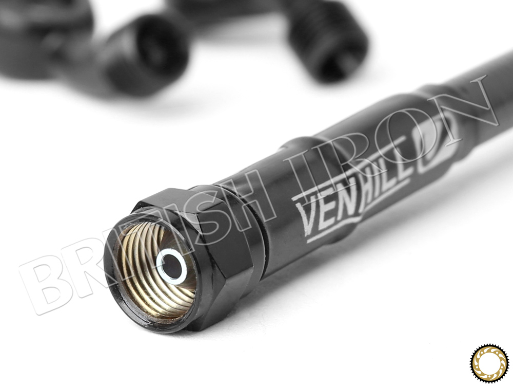 Venhill brake lines use smooth bore DuPont Teflon hose for better heat resistance. Marine grade stainless steel braiding minimizes expansion for better braking force. PVC jacket prevents any abrasions on painted surfaces. Venhill hoses meet or exceed DOT requirements, tested to 1500psi.